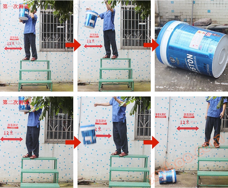 ใช้ชิ้นงานทั้งสามตัวแยกกันฉีดน้ำที่มีความจุที่ระบุและฝาปิดให้แน่นถังที่มีความจุไม่เกิน 11 ลิตรความสูงลดลง 1.5 เมตรถังที่มีความจุมากกว่า 11 ลิตรความสูงลดลง 1.2 เมตรเมื่อลดลงทำให้ด้านล่างของถังของชิ้นงานประมาณพื้นแนวตั้งส่วนล่างของถังจะตีพื้นราบซีเมนต์ขนานแต่ละชิ้นจะตกอย่างต่อเนื่อง 3 ครั้งตรวจสอบการทดสอบการตกและอนุญาตให้มีการรั่วไหลของของเหลวเล็กน้อยในปากถังเมื่อชน